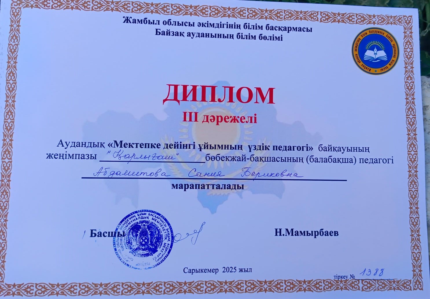 22 сәуір 2025 0 1 2 3 4 5 Мектепке дейінгі ұйымның үздік педагогі "Мектепке дейінгі ұйымның үздңк педагогі" аудандық байқауына тәрбиеші Абдамитова Сания Бериковна қатысып жүлделі ІІІ дәрежелі дипломмен марапатталды.