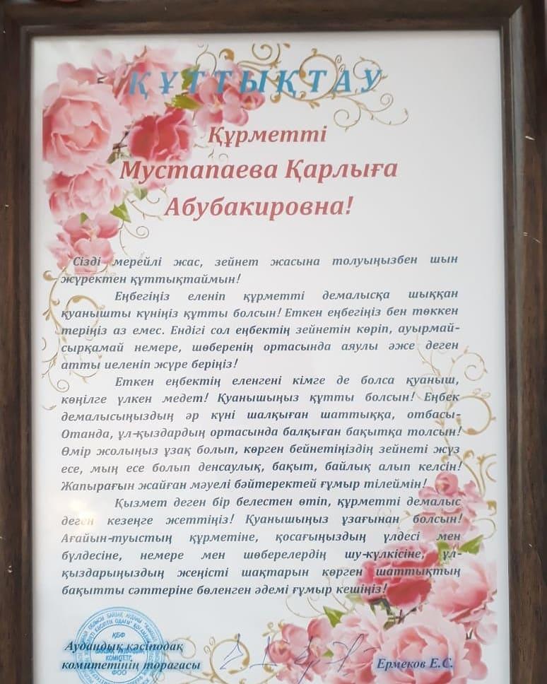 12 желтоқсан 2019 0 1 2 3 4 5 Мустапаева Қарлыға Абубакировнаны құттықтау сәті ҚР Тәуелсіздік мерекесі қарсаңында Аудандық кәсіподақ ұйымынан ұжымның үлкені ақылшы бола білген Мустапаева Карлыга абубакировна еңбегі еленіп,марапатталды.