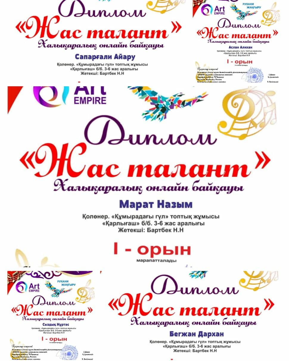03 ақпан 2021 0 1 2 3 4 5 "Жас талант" онлайн байқауы "Жас талант" онлайн байқауының жүлделі орынын жеңіп алған жеңімпаз бүлдіршіндеріміз